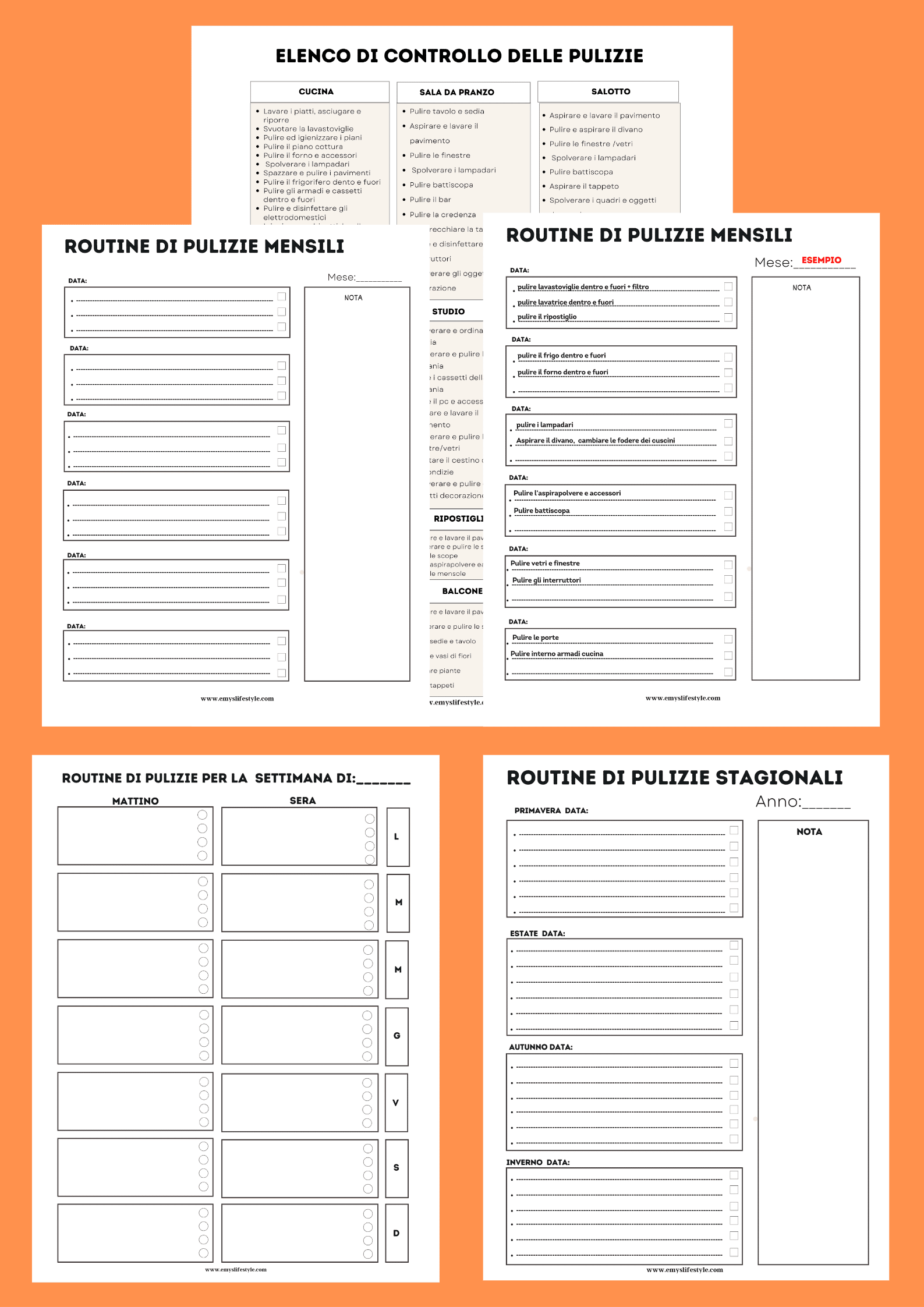 Il planner delle pulizie settimanale è suddiviso in 2 periodi: routine del mattino e routine della sera, pensato per le mamme e donne che lavorano, e che hanno bisogno di un sistema di organizzazione per massimizzare la loro produttività per poter stare al passo di tutte le incumbenze della vita quotidiana.